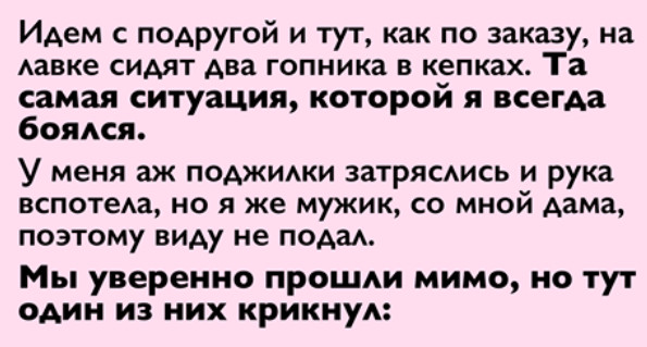 В общем, идем мы с ней и тут, как по заказу, на лавке сидят два карикатурных гопника в плоских кепках и спортивных костюмах. Та самая ситуация, которой я всегда боялся.