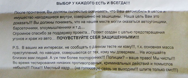 Идея проста: надавить на страхе потерять любимый автомобиль с ценными вещами, которые могут храниться внутри. “Кодграббер” открывает для мошенников двери в авто, после чего они залезают внутрь, но ничего не крадут, а лишь оставляют послание для владельца на сиденье авто, после чего уходят, закрыв дверь, как будто ничего и не случилось.В послании сказано что-то вроде: “Вот, смотрите! Мы вполне в состоянии залезть к вам в машину! А если не хотите худшего — перечислите нам такую-то сумму”, но только более завуалированно, чтобы правоохранительным органам в случае обнаружения не было к чему придраться. Например, требуемую сумму они называют “благотворительной суммой” и “помощью проекту”. И в результате, им действительно нечего предъявить, ведь они ничего не украли и даже ничего не вымогают.